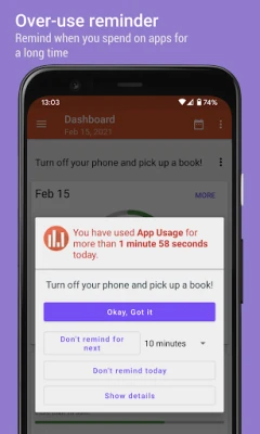 ★ Over-use reminder: remind when you spend on phone or apps for a long time