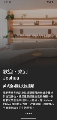 Joshua 透過器械皮拉提斯、墊上皮拉提斯與呼吸控制冥想課程推廣身心合一的生活態度。