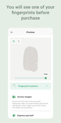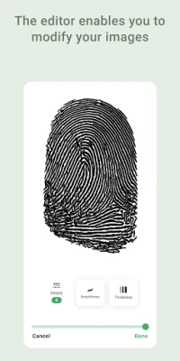 1. Access to three formats of the processed fingerprints: original PNG images, enhanced PNG images and vector SVG images with a tool for editing details, smoothness and thickness.