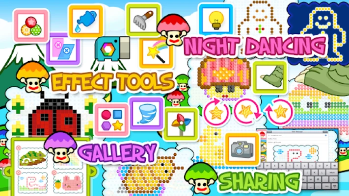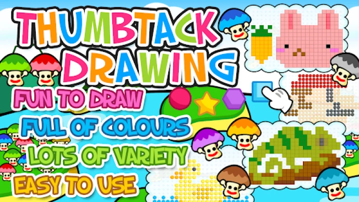 Thumbtack Drawing, one of our creative kit series apps, enables children to create and share their very own pictures by manipulating mushroom tacks of plenty colours and various special effect tools.